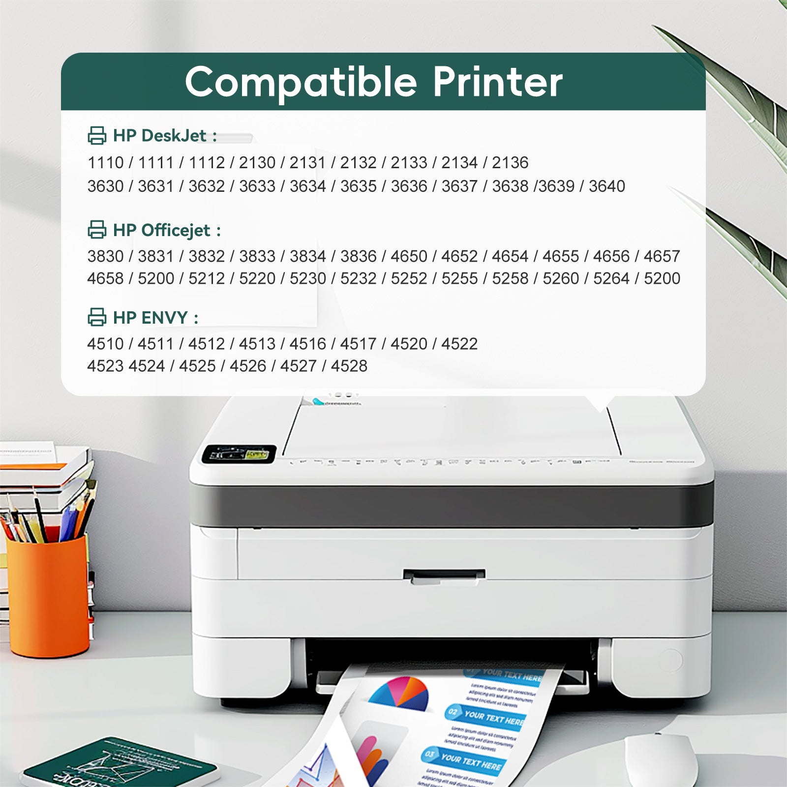 - This cartridge works with: HP DeskJet 1112, 2130, 2132, 3630, 3631, 3632, 3633, 3634, 3636, 3637, 3639; HP ENVY 4511, 4512, 4513, 4516, 4520, 4522, 4524; HP OfficeJet 3830, 3831, 3833, 4650, 4652, 4654, 4655, 5212, 5222, 5230, 5232, 5255, 5260, 5264